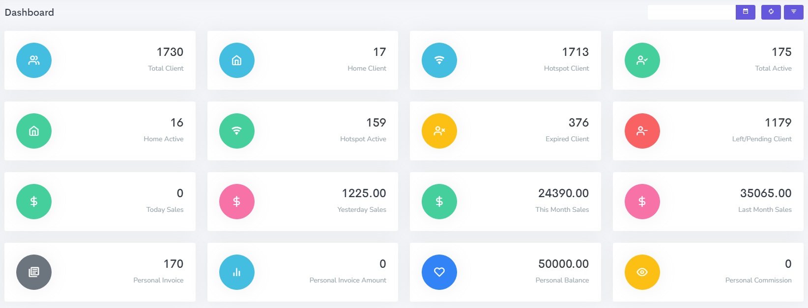 Total Client, Home Client, Hotspot Client, Total Active, Home Active, Hotspot Active, Expired Clients, Left Clients Etc.
