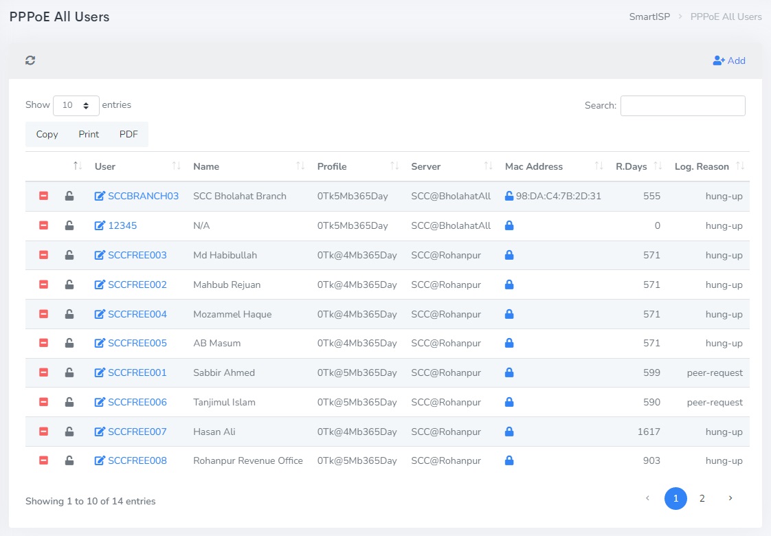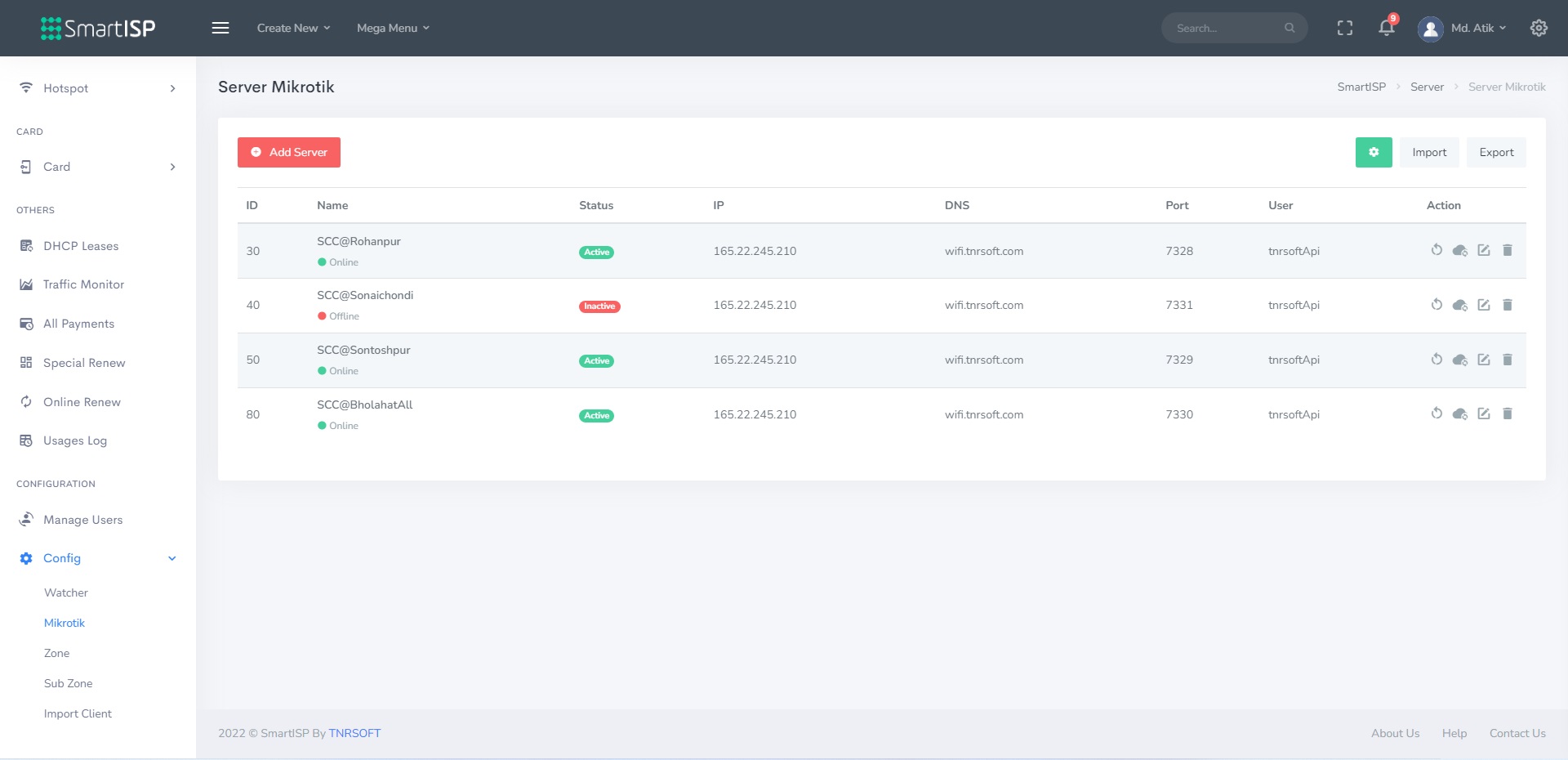 Using these feature you can add multiple Mikrotik servers. You can see all your Mikrotik servers online or offline at a glance. You can also reboot your Mikrotik from here. Also, if for some reason your Mikrotik configuration is reset, then there is an option to easily sync with the panel accounts to your Mikrotik.