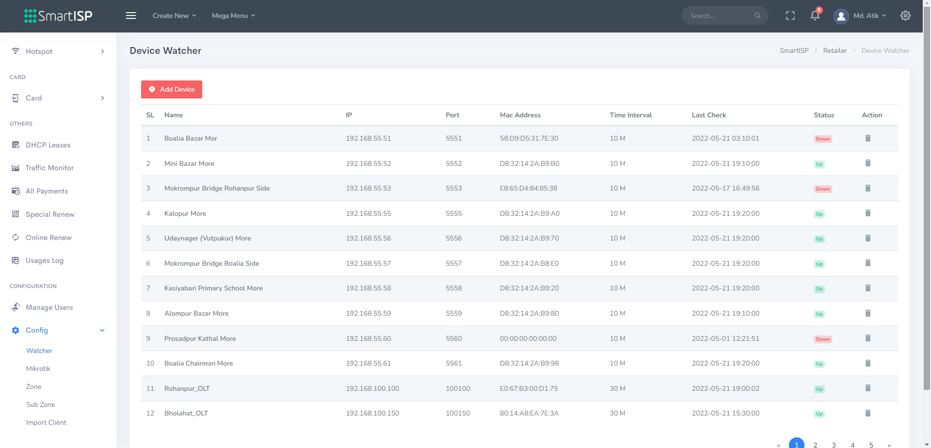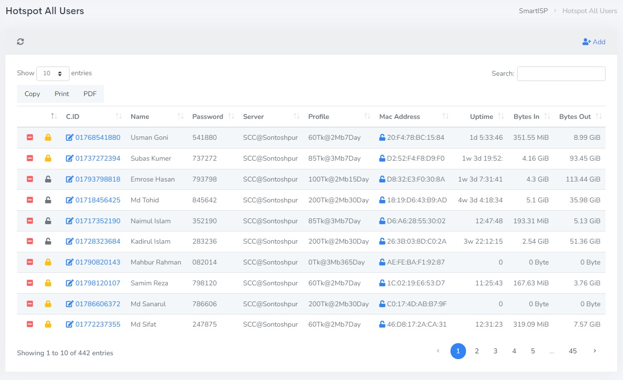 Using this feature you can easily manage your Hotspot users. Here is the facility to add new client, renew with mobile number, Hotspot packages, active user list, online users list etc. There are also Log, MAC Log, Hosts, Change Log, DHCP Leases.