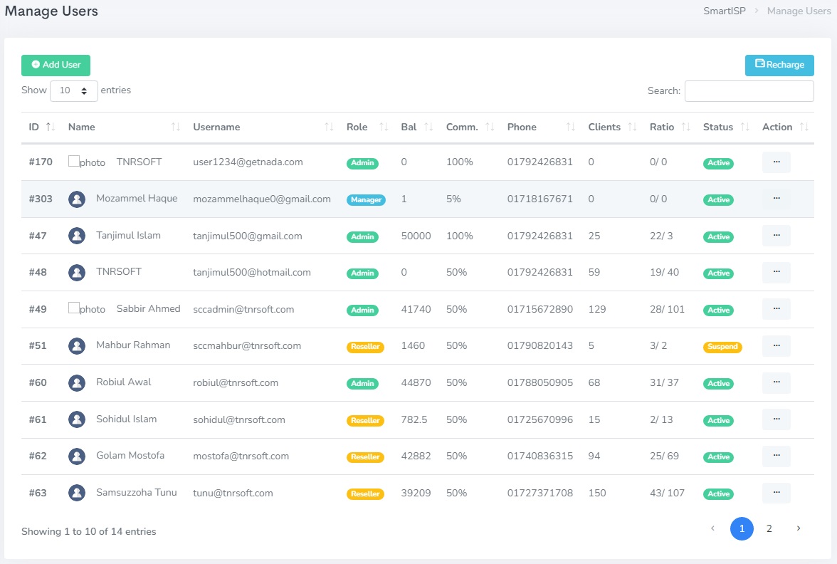 Add User (Admin, Manager, Reseller), Recharge User, Edit Permissions