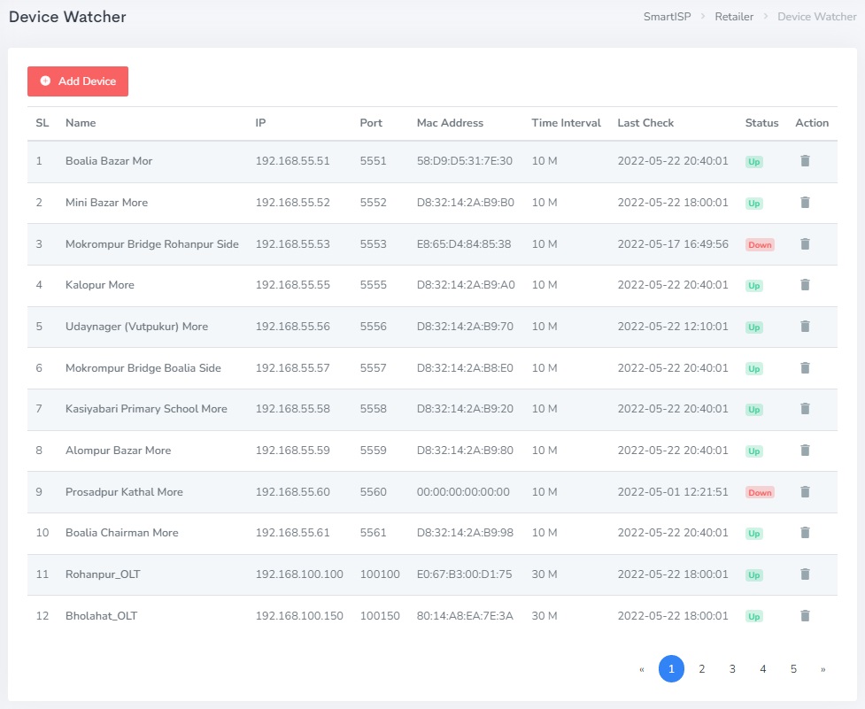 Add Device (OLT, Access Points Devices, Outdoor Routers Etc.), Devices Status (Online/Offline)